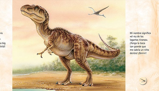 ¡Bienvenido al mundo del tiranosaurio! Viaja millones de años al pasado con este enorme dinosaurio como guía. Te sorprenderá lo mucho que pesaron y lo grandes que eran, la fuerza de sus piernas y sus dientes realmente aterradores. Aprenderás cómo comían los tiranosaurios y cómo se defendían los otros dinosaurios cuando llegó el “rey”. Aprende por qué desaparecieron y cómo descubrimos sus esqueletos. Además de ilustraciones realistas a todo color, este libro incluye textos en inglés y español y una página con datos interesantes y trivialidades sobre los dinosaurios.